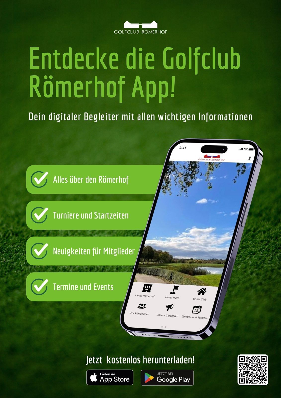 Laden Sie die App auf Ihr Smartphone (einfach „Römerhof“ in der Suchleiste eingeben oder den QR-Code nutzen) und registrieren Sie sich direkt auf der Startseite mit Ihrem Namen und Ihrer E-Mail-Adresse. Nach einer kurzen Prüfung (in der Regel innerhalb von 24 Stunden) stehen Ihnen nicht nur die allgemeinen Funktionen, sondern auch der exklusive Mitgliederbereich des Golfclubs zur Verfügung.